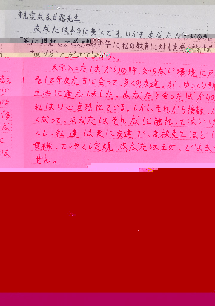 當問及問什麼用日文寫信時,呂晉表示,他從小喜歡日本動漫,喜歡日本動漫導演、作家新海誠。新海誠的文字很美,生動感人。呂晉說道,聽到學校組織“給輔導員的一封信”,就想用日文來書寫這封信,以表達他對甘老師的謝意。“您真的很迷人,感謝您出現在我的世界裡,感謝您對我半年來的指導。”