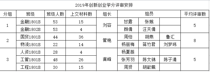 評審工作按照專業分為三組進行,三位領導分别擔任組長。共對來自7個班級的114材料進行認定。
