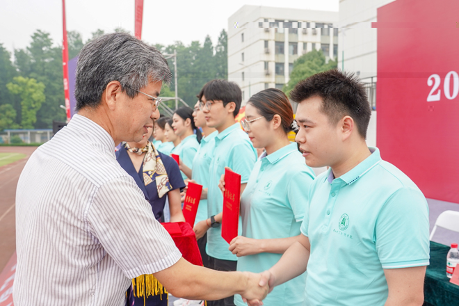 校黨委書記彭德忠為優秀畢業生代表頒獎,祝福他們攜帶着沉甸甸的榮譽,在今後的學習和生活中,勇擔時代重任,志存高遠,腳踏實地,奮力譜寫青春贊歌。