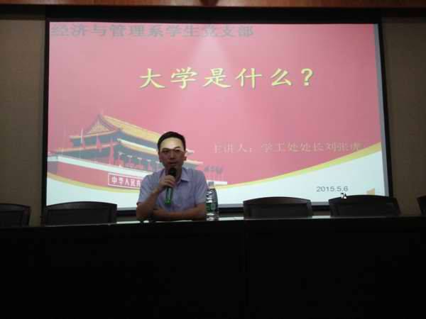 5月6日晚上18:30,學院學工處處長劉張虎為經管系22期黨校學員做“大學是什麼”的主題報告。經濟與管理系全體輔導員、黨員、預備黨員和第22期入黨積極分子參加。主題報告由系副書記劉銳主持。