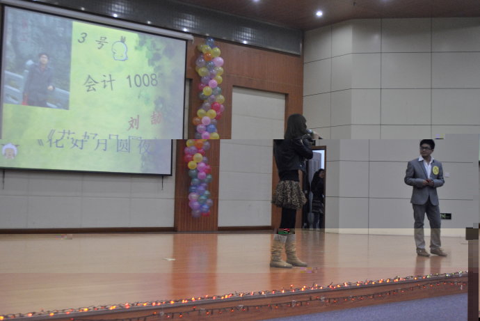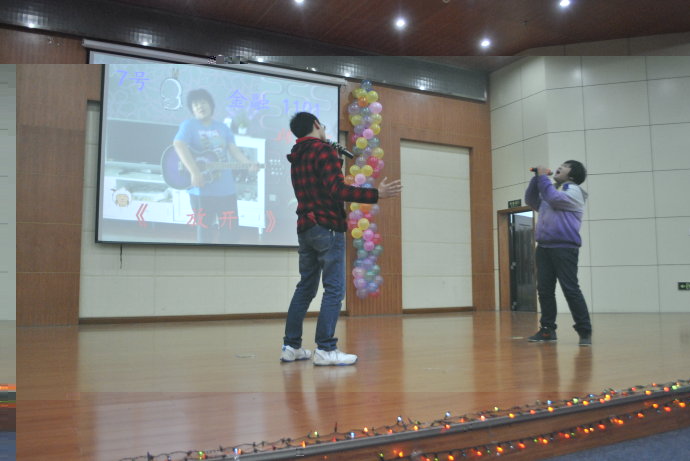 本大賽共分為四大環節,從七名參賽選手中選出四名選手争奪冠亞季軍,通過第一輪的搭檔合唱選出了一名選手直接進入四強,經過激烈的車輪戰,分别産生了當晚的四強選手,他們分别是劉嘉文,張喆,韓涵宇,劉劼。在比賽過程中,文藝部表演的節目帶動了全場的氣氛,在第二輪大賽評分階段更有第一屆K歌大賽的冠軍馬俊傑給大家獻唱,他的演唱将活動氣氛推向了高潮,最後6号選手劉嘉文以一曲《忽然之間》奪得桂冠,第二、三名依次為張喆、劉劼。