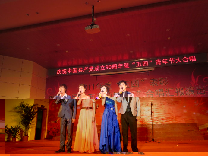 2011年5月4日下午2時30分, 由院裡主辦的中國共産黨成立90周年暨“五四”青年節大合唱活動在我院行政樓201教室内如期舉行.出席本次活動的嘉賓有劉剛院長,各系書記,主任,輔導員,院團委學生會,各系部團委學生會代表.優秀團員幹部,各班團支書等. 在國歌奏響後進行了表彰大會. 3時左右,表彰大會結束,第五屆“五月的鮮花”大合唱正式開始. 參加本次大合唱的有各系代表隊,院廣播台詩歌團及院藝術團合唱隊。我系代表隊演唱歌曲《南屏晚鐘》,以及由老師們帶來的合唱。活動與4時30分左右圓滿結束。
