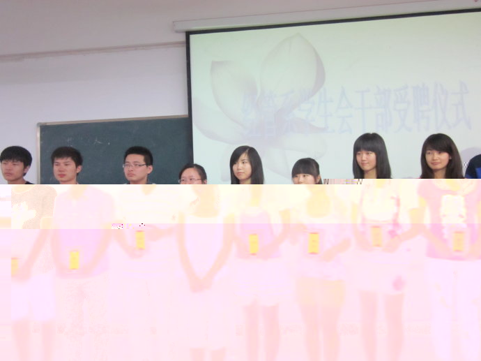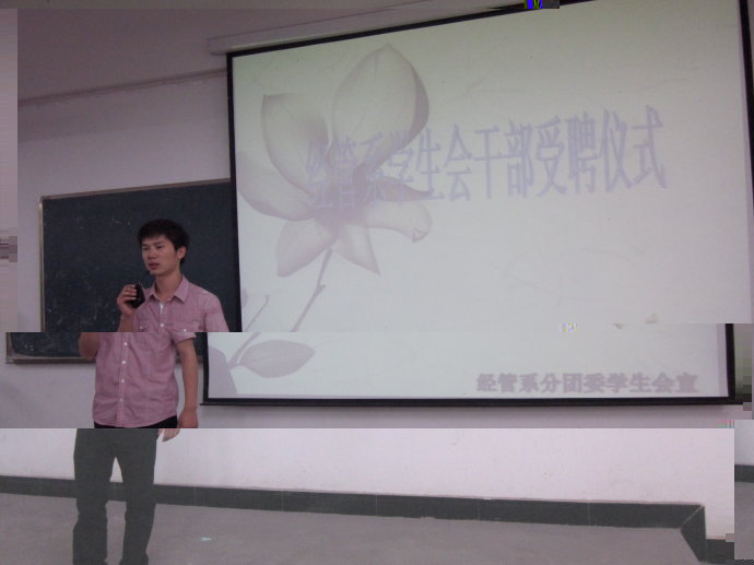2011年6月13日晚7時由經管系分團委學生會主辦的經管系學生會幹部受聘儀式在4棟211教室内如期舉行,曆任經管系學生會主席幸博,曆任經管系學生會書記母潤鑫,現經管系學生會書記吳雅婷,現經管系學生會主席王雷出席本次受聘儀式。