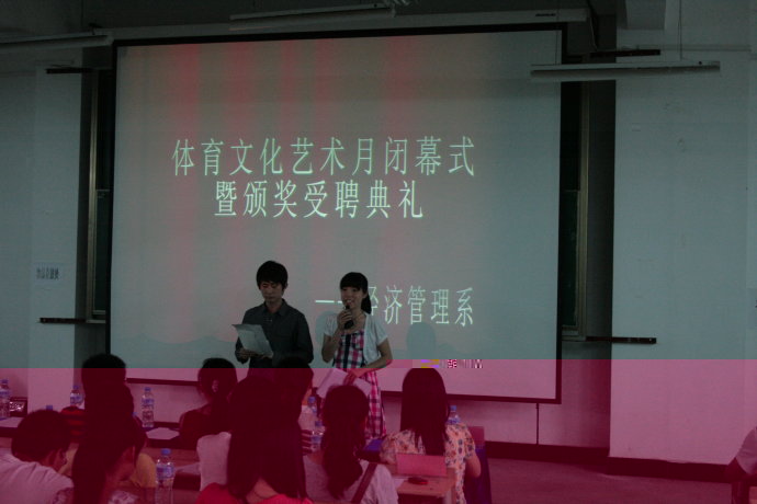 2010年6月21日,18點30分在4棟教學樓舉行了體育文化月的閉幕式暨頒獎典禮儀式。體育文化藝術月是由經濟管理系主辦,活動曆時2個月。這次活動主要有知識競賽,團體跳繩,拔河等項目,經過2個月的角逐,各項的優勝者已得出,并在此次的閉幕式公布,并予以頒獎。 經濟管理系分團委學生會指導老師表示,此次活動取得圓滿成功,獲得全系師生的好評。